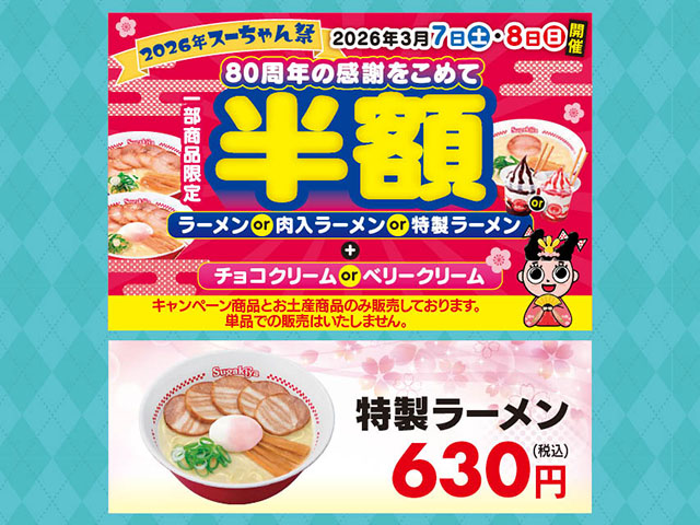 人気のラーメンとデザートを組み合わせた特別セットを3月7日・8日の2日間、スガキヤでは6種のセットメニューを